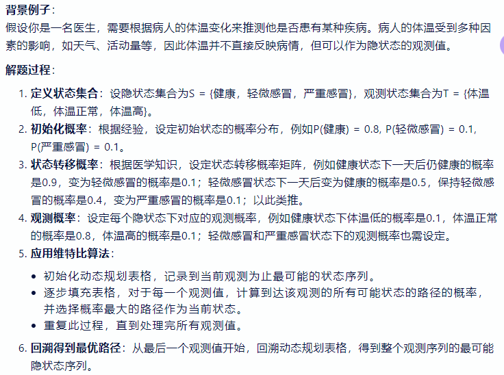 - 一种动态规划算法,用于求解隐马尔可夫模型(Hidden Markov Model, HMM)中最可能的状态序列。HMM 是一种统计模型,用于描述一个含有隐含未知参数的马尔可夫过程,即系统的状态是不可观察的(隐状态),但可以通过观察一些与状态相关的可见数据来推断状态。