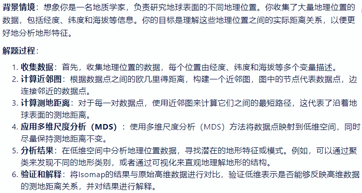 - 一种流形学习技术,用于发现高维数据中的低维结构。它通过保持数据点之间的测地距离(即沿着数据流行表面的实际距离)来构建低维表示,这与传统的多维尺度分析(MDS)方法有所不同,后者保持的是欧几里得距离