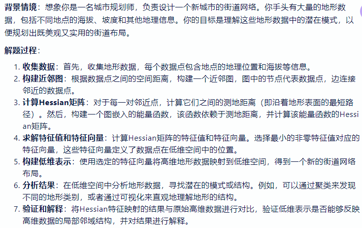 - 一种流形学习算法,用于发现高维数据中的低维结构。它通过优化一个带约束的图嵌入问题来工作,该问题考虑了数据点的局部邻域结构,并使用 Hessian 矩阵的特征值和特征向量来计算低维嵌入