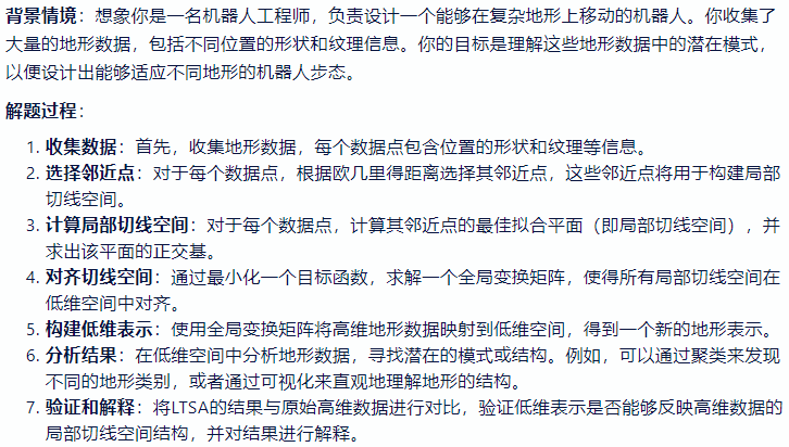 - 一种流形学习算法,用于发现高维数据中的低维流形结构。LTSA 的基本思想是将高维数据点映射到低维空间,同时保持每个数据点在其局部邻域内的切线空间结构