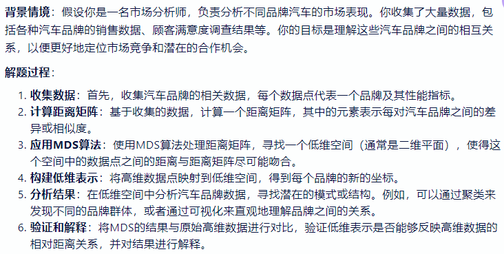 - 一种用于数据分析和可视化的技术,旨在在低维空间中放置高维数据点,以便数据点之间的相对距离得以保留。MDS 试图找到一个低维表示,使得数据点之间的距离(通常是欧几里得距离)与原始高维数据的距离矩阵尽可能相似