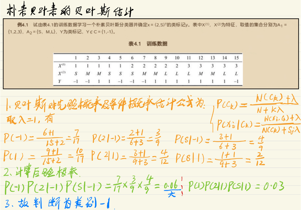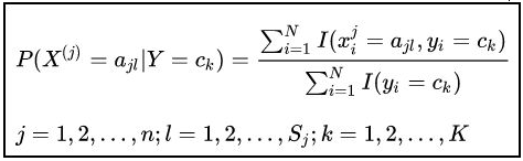 - 条件概率的贝叶斯估计(Sj 为特征 X (j) 可能取值个数)