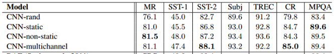 - CNN-rand: 所有的 word vector 都是随机初始化的,同时当做训练过程中优化的参数;