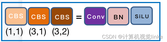 - CBS: 主要是由 Conv+BN+SiLU,颜色表示卷积使用不同的 size、stride