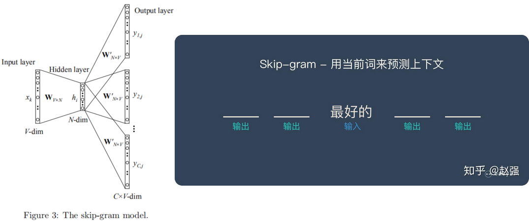 Skip-Gram,从直观上理解,CBOW 是给定上下文,来预测当前值,而 Skip-Gram 是给定当前值来预测上下文