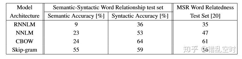 - 测试结果如下图所示,在相同数据上训练的 640 维词向量,CBOW 在句法层面上表现得较好,Skip-gram 在语义层面上表现得更好,总体来说还是 Skip-gram 更好些