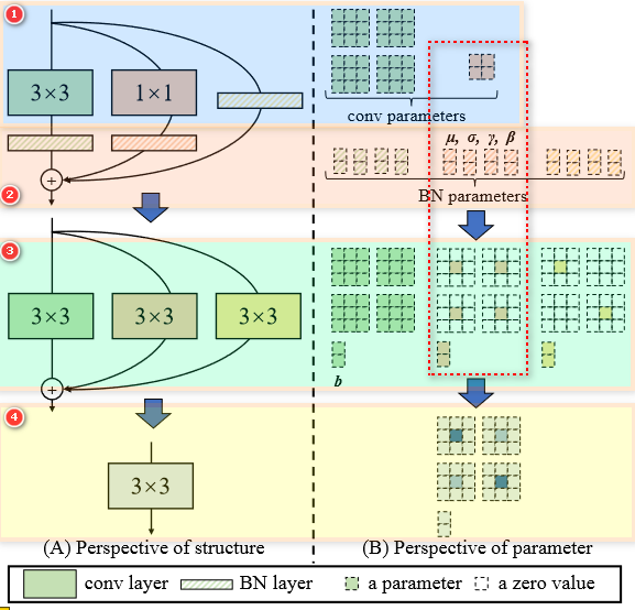 - 3. 融合卷积与 BN 层:(1) 最难理解的是虚线红框部分,由原来的 变为 ,也就是单个卷积核由 变为 ,这是通过在 四周补 0 做到的,因为补 0 后得到的卷积和是不变的;(2) 类似 ACNet 的网络结构的过程, 的部分参数用于重构卷积核的值,部分参数组合成卷积的偏置值 ,并且每个通道 1 个值