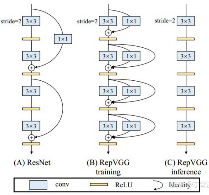 - 训练时在 VGG 网络的 Block 块中加入了 Identity 和残差分支,解决性能差的问题。推理时通过 “结构重参数化” 将所有的网络层都转换为 Conv3x3,便于网络的部署和加速