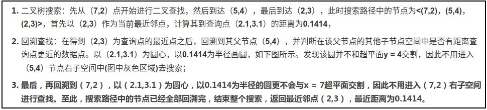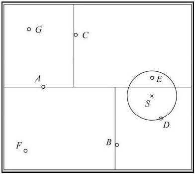 - 首先在 kd 树中找到包含点 S 的叶结点 D(图中的右下区域),以点 D 作为近似最近邻。真正最近邻一定在以点 S 为中心通过点 D 的圆的内部。然后返回结点 D 的父结点 B,在结点 B 的另一子结点 F 的区域内搜索最近邻。结点 F 的区域与圆不相交,不可能有最近邻点。继续返回上一级父结点 A,在结点 A 的另一子结点 C 的区域内搜索最近邻。结点 C 的区域与圆相交;该区域在圆内的实例点有点 E,点 E 比点 D 更近,成为新的最近邻近似。最后得到点 E 是点 S 的最近邻