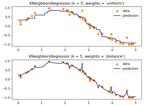 - 基于邻居的回归可用于数据标签为连续变量而非离散变量的情况。分配给查询点的标签是根据其最近的邻居的标签的平均值计算出来的
