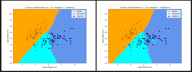 - 基本的近邻分类使用统一的权重:也就是说,分配给一个查询点的值是由近邻的简单多数投票计算出来的,即 weights = ‘uniform’ ; weights = ‘distance’,按与查询点距离的倒数分配权重。或者,可以提供一个用户定义的距离函数来计算权重