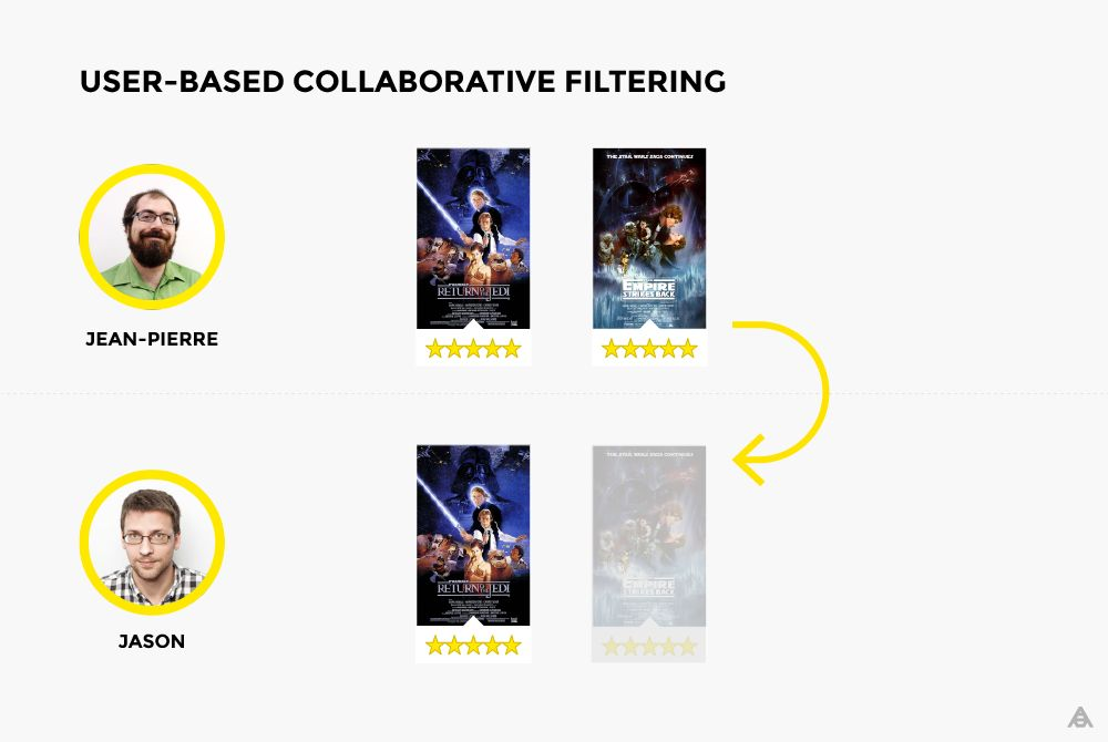 - 基于用户的协同过滤本质上是寻找与我们的目标用户具有相似品味的用户。 如果 Jean-Pierre 和 Jason 曾对几部电影给出了相似的评分,那么我们认为他们就是相似的用户,接着我们就可以使用 Jean Pierre 的评分来预测 Jason 的未知评分。例如,如果 Jean-Pierre 喜欢星球大战 3: 绝地武士归来和星球大战 5: 帝国反击战,Jason 也喜欢绝地武士归来,那么帝国反击战对 Jason 来说是就是一个很好的推荐。一般来说,你只需要一小部分与 Jason 相似的用户来预测他的评价