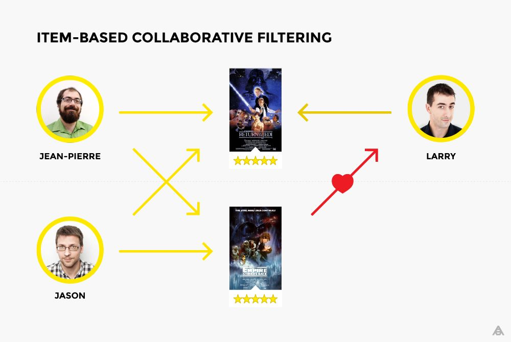- 基于物品的协同过滤过程很简单。两个物品的相似性基于用户给出的评分来算出,这里的相似度是根据列而不是行来计算的。 回到 Jean-Pierre 与 Jason 的例子,他们两人都喜欢 “绝地武士归来” 和 “帝国反击战”。 因此可以推断,喜欢第一部电影的大多数用户也可能会喜欢第二部电影。所以,对于喜欢 “绝地武士归来” 的第三个人 Larry 来说,” 帝国反击战 “的推荐将是有意义的