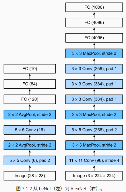 - AlexNet:5 个卷积层、2 个全连接隐藏层和 1 个全连接输出层