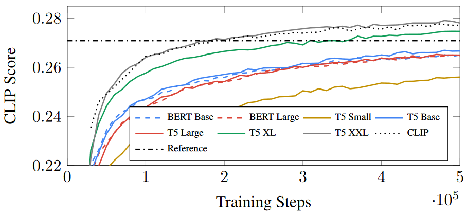 - 在同一训练步长下,各模型得分有明显差异,CLIP 得分:T5 XXL > CLIP > T5 XL > T5 Base