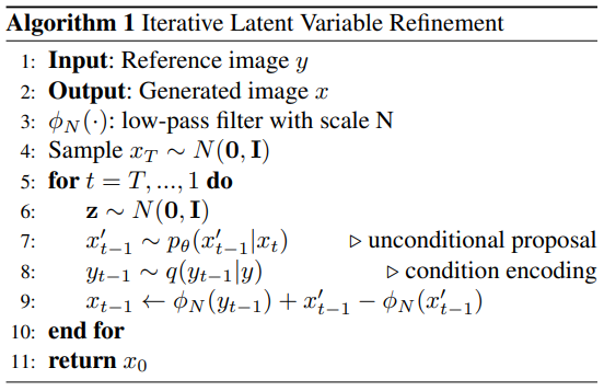 - 2)令 ϕN(⋅) 代表一个线性的低通滤波操作,一系列的上下采样,缩放因子为 N,给定一个参考图片 y,那么其对应的条件就是,确保 ϕN(x0)=ϕN(y)。其物理意义是想要生成的样本和 reference image 共享语义信息,语义信息具体层次由缩放因子决