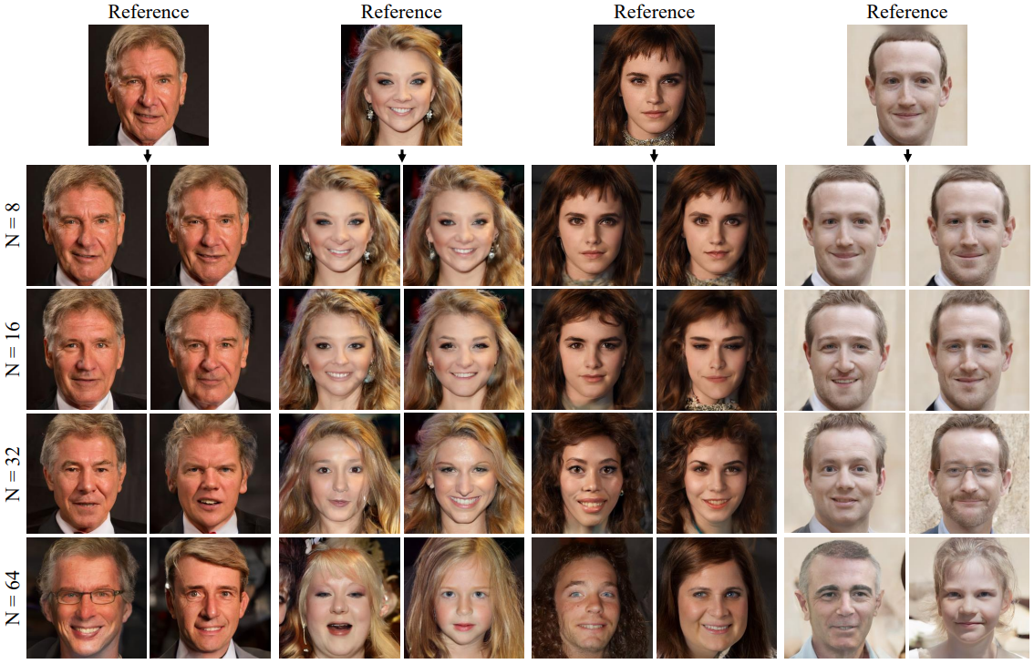 - 下采样率 N 是一个超参数, N 越小,保留细节越多,生成图像就越接近参考图像。作者还指出,我们不一定在整个逆向过程都用到参考图像,可以只选择某些步用。选的步数越多,留给随机采样的发挥空间就越少,生成图像也越接近参考图像