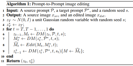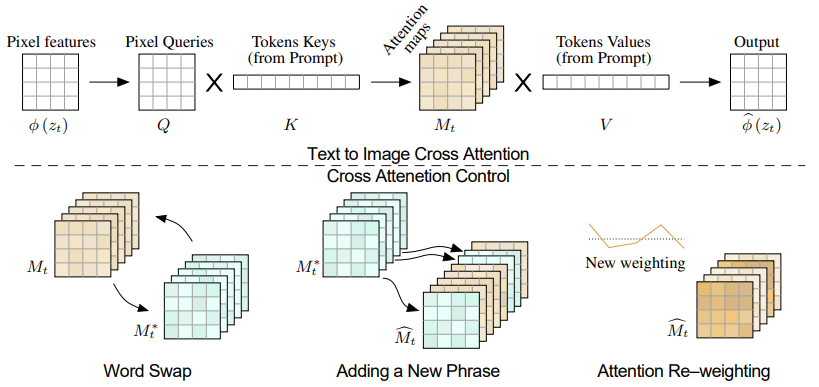 - 图片上半部分是文生图过程中,图片 token 和文本 token 构建交叉注意力 attention map ,并基于这个注意力估计噪声;下班部分是利用未修改 prompt 前的交叉注意力 attention map 编辑修改 prompt 后的交叉注意力 attention map ,输出新的交叉注意力 的过程