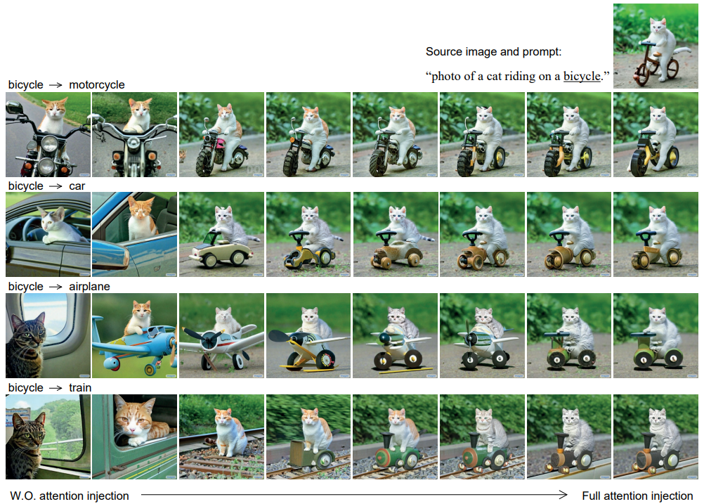 - 模型不仅限于修改纹理,也可以修改结构,把 “自行车” 改为 “小汽车”。为了分析 attention 的注入的效果,最左边一列是没有用 cross-attention 注入的结果,改了一个词就导致整个画面不同了。从左到右展示了逐步增加 “注入操作” 的扩散步数,也就是说越靠右,就有越多的步数注入了 attention。可以看出有更多注入操作后,图像与原图就有跟高的一致性。然而在所有步骤中都用注入操作未必能让生成效果达到最好,因此可以通过控制注入步数,让用户更好地控制图像与原始图像的一致性