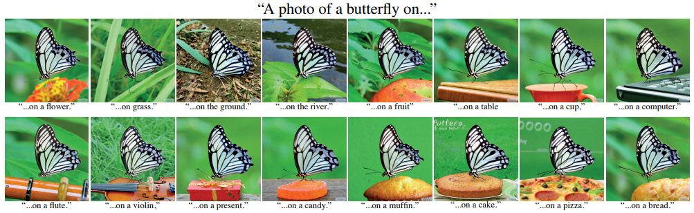 - Prompt-to-prompt 可以用文本对图片进行局部修改而不需要画 mask,这张蝴蝶图,不管蝴蝶在什么东西上,蝴蝶本身的构图都没有变化