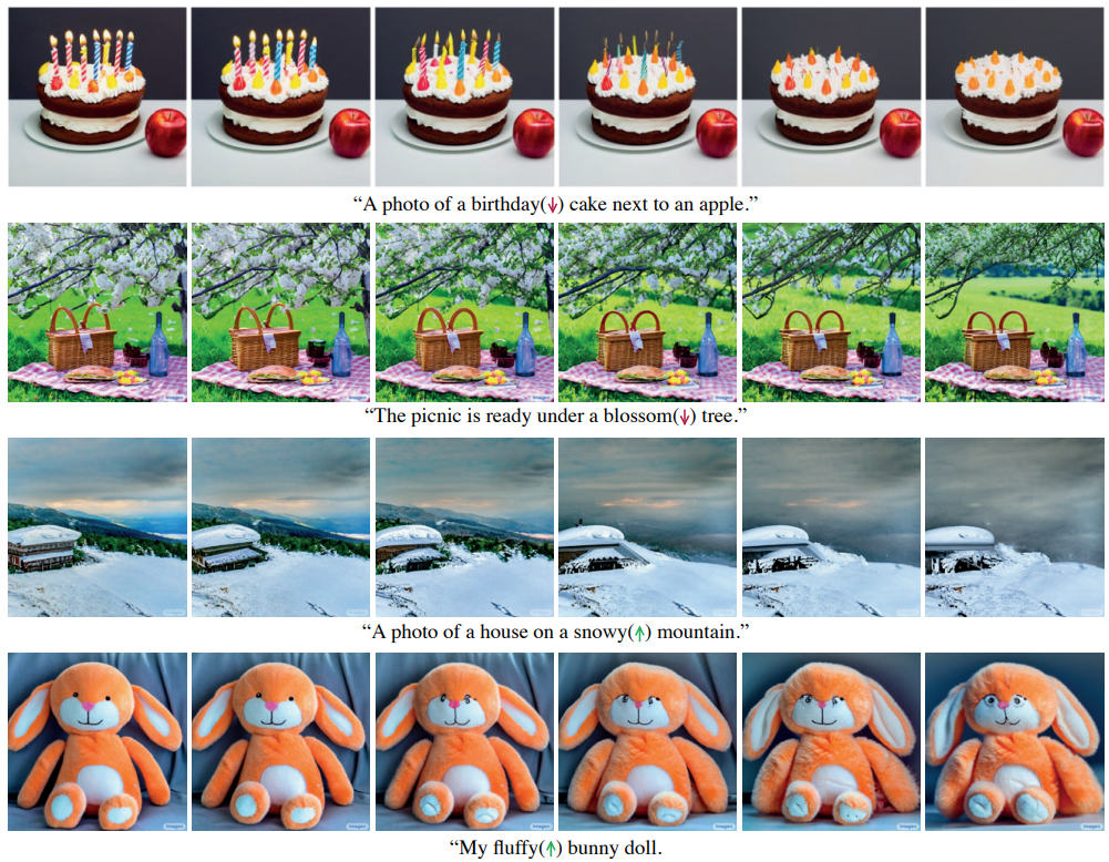 - 这里证明,通过控制某个词的权重,可以控制这个词对图像的影响大小):尽管用 prompt 控制图像编辑非常有效,但任然不能完全控制图像。考虑 prompt “雪山”,一个用户也许想控制山上的积雪量,然而很难用语言描述期望的雪量,所以这里作者引入 fader 控制,有了它用户就可以控制特定单词的影响大小