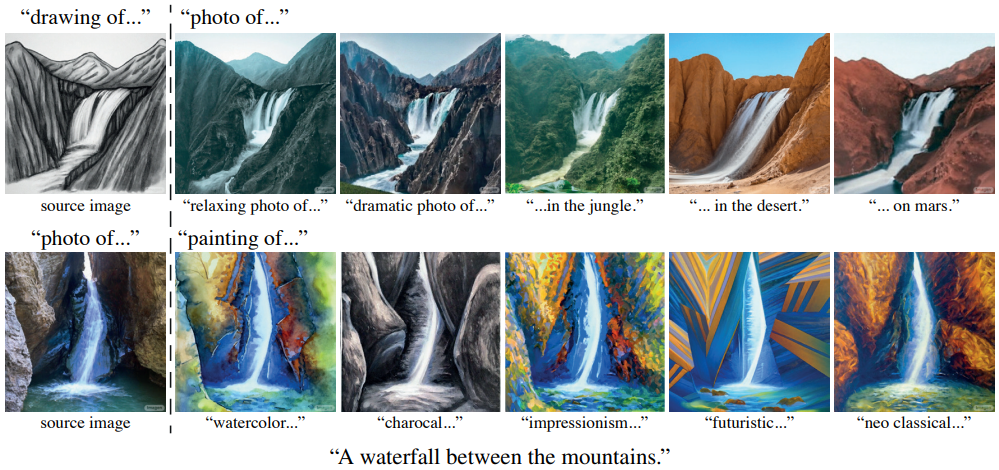 - 不仅能改局部图,也能改整幅图。在这个设置下,编辑操作应该影响图像的所有部分,但任然保持原图的构图,例如目标的位置和样子,看这张图,可以把素描转为真实风格,也可以把真实风格改为艺术风格