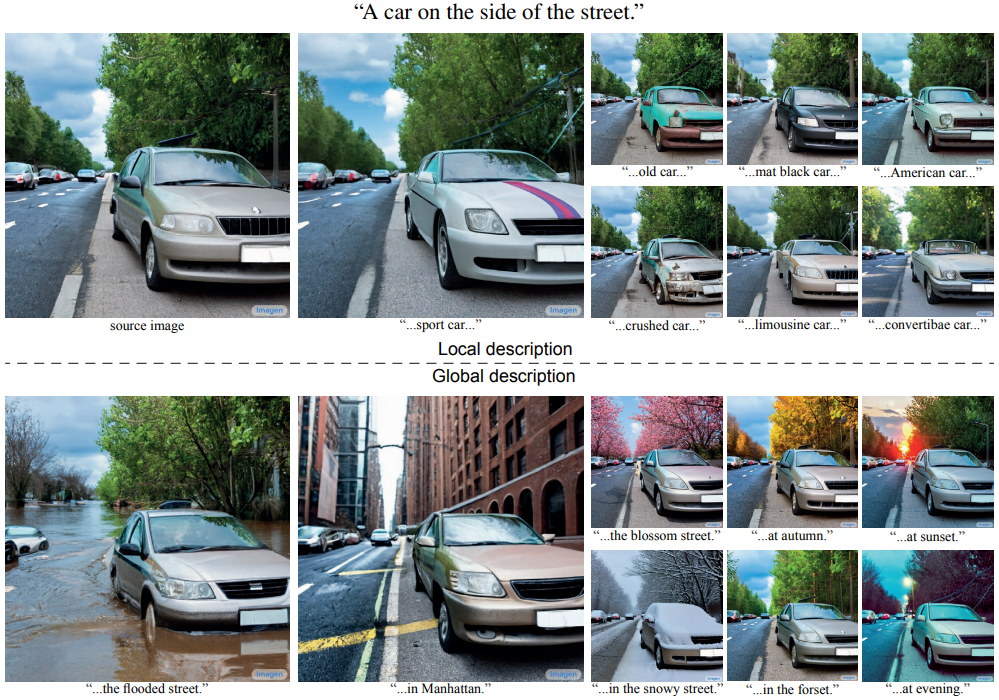 - 除了替换某个词,用户可能会加一些新词来生成图像。在这种情况下,保持原来 prompt 的 attention maps 不变,允许生成器处理添加的新词。例如下面这张图,图的第一行增加了对车的描述,使得车变了背景没变