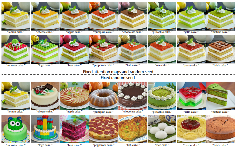 - 对于文生图模型,如果只是修改文本的某些字符,其生成的图片一般变化很大(如图下,只固定随机种子),Prompt-to-prompt 希望保留图片的大部分区域,让文本变化只作用于目标区域(如图上,固定随机种子和 attention map),蛋糕保持原始输入形状,只是配色和装饰在变化