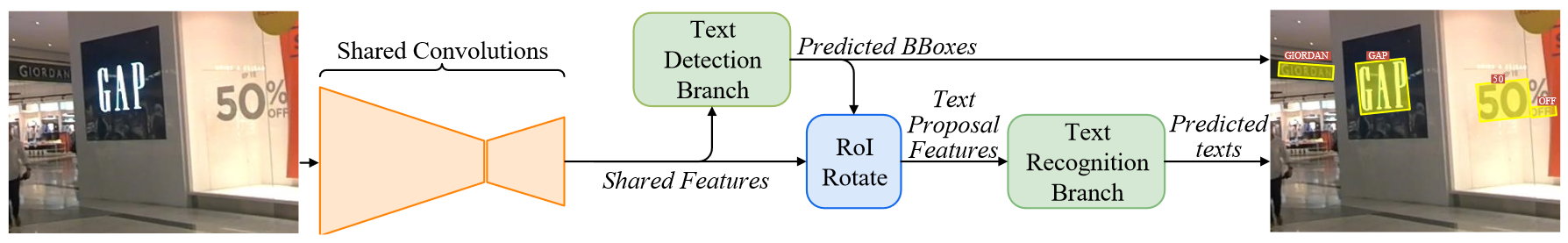 第一个端到端解决文本识别的模型,相比较两阶段的文本定位方法,它的检测速度更快,基本思路是通过文本检测分支实现文本行区域的提取,然后通过 RoIRotate 模块实现文本行的 “摆正”,最后使用 CRNN+CTC 的模式实现文本行的字符识别