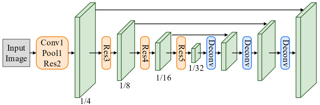 - shared convolutions:使用 Resnet 搭建,首先使用下采样,然后使用反卷积上采样,并且使用类似 SegNet 的高分辨率连接到低分辨率的连接