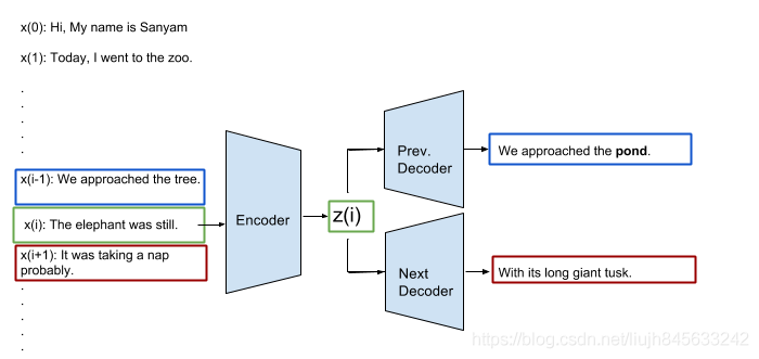 借助 skip-gram+seq 2 seq 的思想,学习 "句向量",通过中心句子,预测上下文句子。首先使用编码器提取中心语句的特征,然后使用两个编码器分别预测上文句子和下文句子。