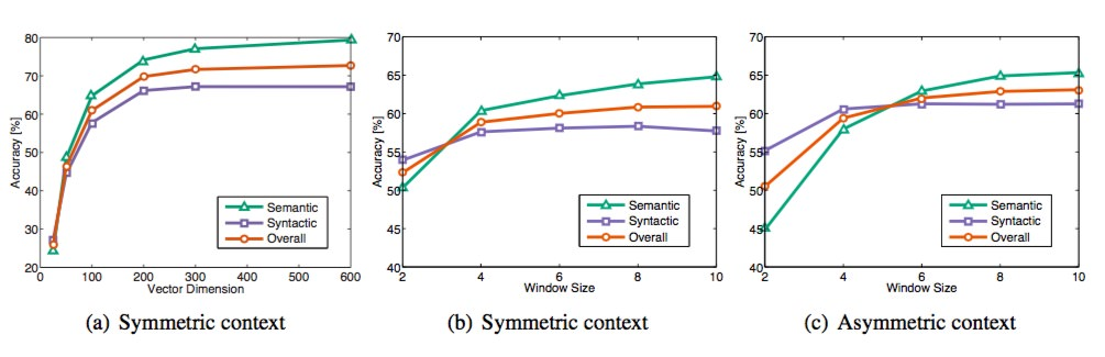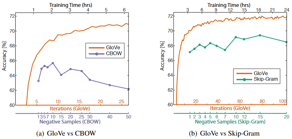 GloVe 是如何训练的?上图是语义准确度,语法准确度以及总体准确度。那么我们不难发现 Vector Dimension 在 300 时能达到最佳,而 context Windows size 大致在 6 到 10 之间 标签问题 :GloVe 是无监督的,但是它的标签不像 word 2 vec 一样的 one-hot 标签,而是共现矩阵取对数词向量 :最终学习得到的是两个 vector 是 w w w 和 w ~ \widetilde{w} w ,因为 X 是对称的(symmetric),所以从原理上讲 w w w 和 w ~ \widetilde{w} w 是也是对称的,他们唯一的区别是初始化的值不一样,而导致最终的值不一样。所以这两者其实是等价的,都可以当成最终的结果来使用。但是为了提高鲁棒性,我们最终会选择两者之和 w w w + w ~ \widetilde{w} w 作为最终的 vector Word2vec 与 glove 的区别?GloVe 与 word2vec,两个模型都可以根据词汇的 “共现 co-occurrence” 信息,将词汇编码成一个向量(所谓共现,即语料中词汇一块出现的频率) word2vec 是局部语料库训练的,其特征提取是基于滑窗的;而 glove 的滑窗是为了构建 co-occurance matrix,是基于全局语料的,可见 glove 需要事先统计共现概率;因此,word2vec 可以进行在线学习,glove 则需要统计固定语料信息 word2vec 是无监督学习,同样由于不需要人工标注;glove 通常被认为是无监督学习,但实际上 glove 还是有 label 的,即共现次数 l o g ( X i j ) log(X_{ij}) l o g ( X i j ) word2vec 损失函数实质上是带权重的交叉熵,权重固定;glove 的损失函数是最小平方损失函数,权重可以做映射变换 总体来看,glove 可以被看作是更换了目标函数和权重函数的全局 word2vec ,上图是单词类比任务的总体准确度与训练时间的函数关系,可知 GloVe 比 word 2 vec 有更好更快的训练效果 参考: