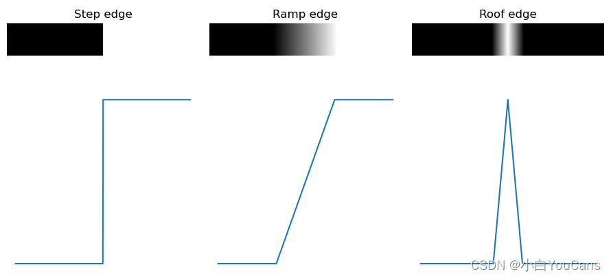 - 台阶模型,对应于阶跃信号,边缘模型是灰度级在相邻像素点发生垂直的台阶突变;