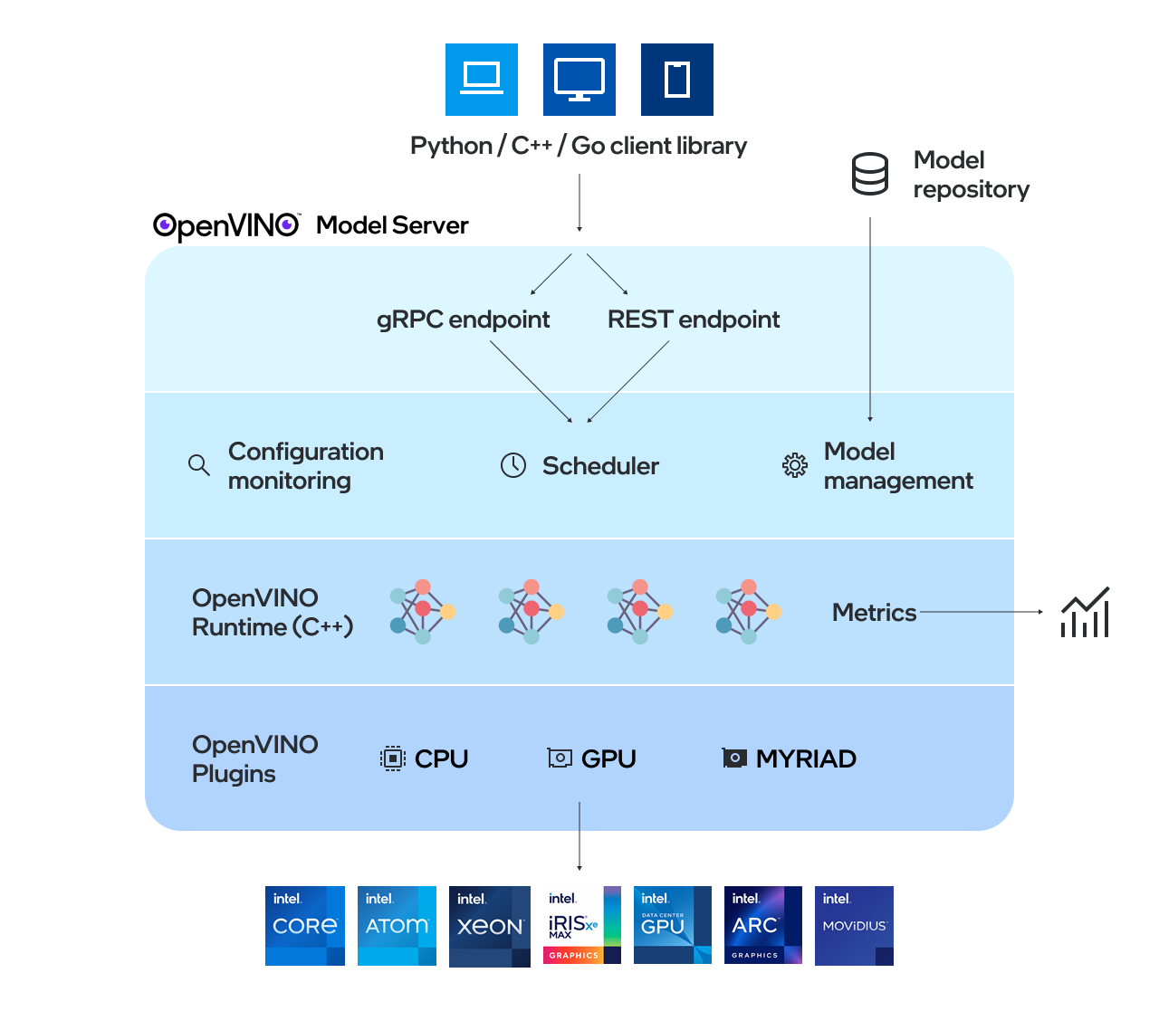 - 种用于为模型提供服务的高性能系统。该模型服务器使用 C++ 实现以实现可扩展性,并针对在 Intel 架构上的部署进行了优化,在应用 OpenVINO 执行推理时。推理服务通过 gRPC 或 REST API 提供