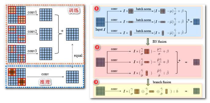 - 3. 融合卷积与 BN 层:(1) 最难理解的是虚线红框部分,由原来的 变为 ,也就是单个卷积核由 变为 ,这是通过在 四周补 0 做到的,因为补 0 后得到的卷积和是不变的;(2) 类似 ACNet 的网络结构的过程, 的部分参数用于重构卷积核的值,部分参数组合成卷积的偏置值 ,并且每个通道 1 个值