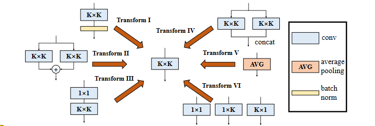 - 4. 利用卷积的可加性,融合多路径:对应同 size 卷积核的,可以利用卷积的可加性,将卷积融合,具体来说是卷积核矩阵对应相加,偏置值对应相加