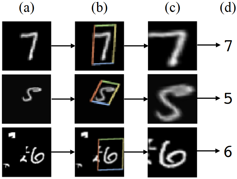 - 能不能通过模型去学习这种 “变换过程” 呢?STN 给出答案,上图 abc 分别是原图、变换矩阵处理区域、处理后的图片。所谓的变换过程,就是学习仿射变换矩阵的 6 或 9 个参数,为了使得这 9 个参数可微,使用双线性插值对变换后的矩阵采样。