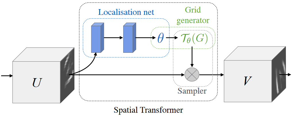 - STN 的网络结构包含以下 3 个部分,其中 U 是图片或特征,V 是经过变换后的输出