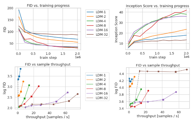 - LDMs 在潜空间的下采样系数 ,也就是 autoencoder 的下采样因子 f ,其中 ,如果 f=1 那就等于没有对输入的像素空间进行压缩,如果 f 越大,则信息压缩越严重,可能会噪声图片失真,但是训练资源占用的也越少