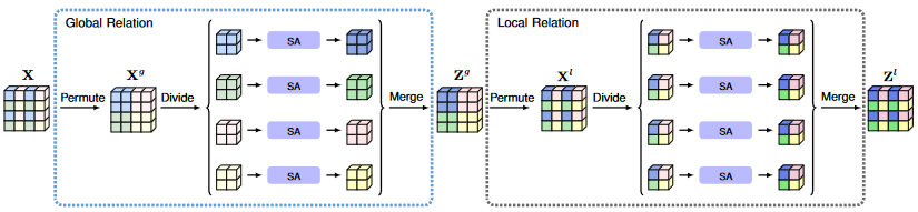 - Global 注意力:首先对输入 X 进行分组采样,每组之内构建空间注意力,然后合并所有组的结果,得到全局注意力矩阵