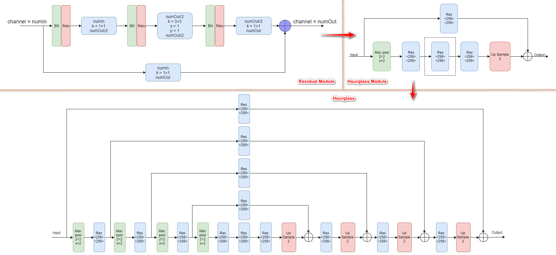 - Hourglass 认为识别脸和手是需要局部信息的,而整体的姿态识别需要整个身体的信息。因此,整合各种尺度的信息是必要的。采取重复的自底向上、自顶向下模块学习图片特征,相当于使用不同的感受野观察图片,结合中间监督,加速模型收敛