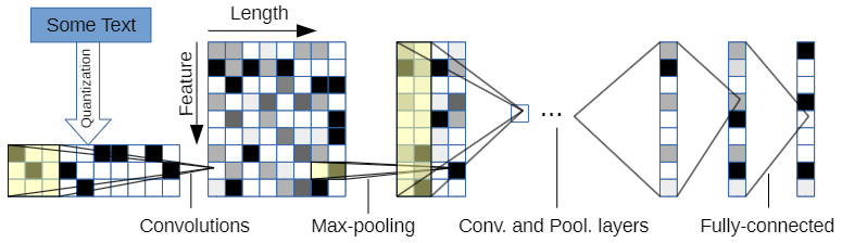 - 目前很多语言模型是针对单词、短语、句子建模的,或者对语义和语法结构进行分析,但是本文则提出了从字符层面进行文本分类,提取出高层抽象概念