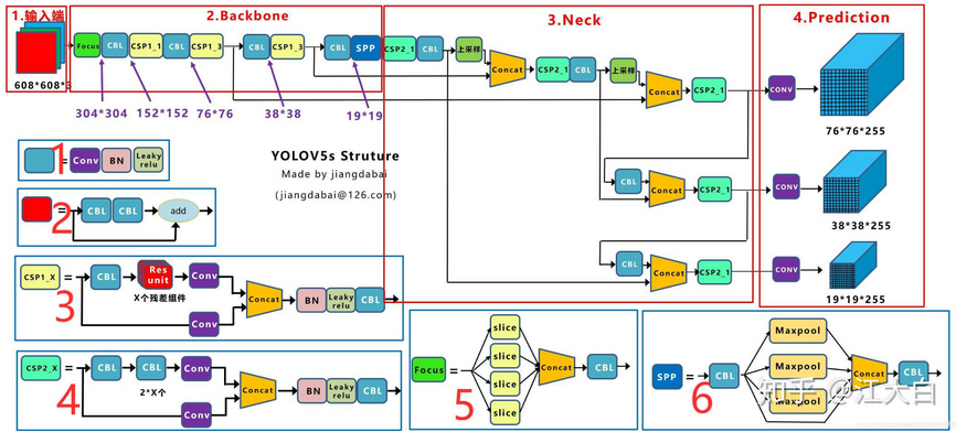 - 网络中的 1、2、3、4、5、6 分别时组成 YOLOv5 的基础组件,即:CBL 模块、Res 模块、CSP1_X、CSP1_X、Focus 结构、SPPF