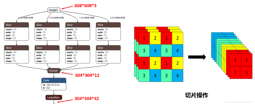 和 YOLOv2 使用传递层(passthroughlayer)相似,通过 slice 操作来对输入图片进行裁剪。原始输入图片大小为 608 * 608 * 3,经过 Slice 与 Concat 操作之后输出一个 304 * 304 * 12 的特征映射;接着经过 Conv 层