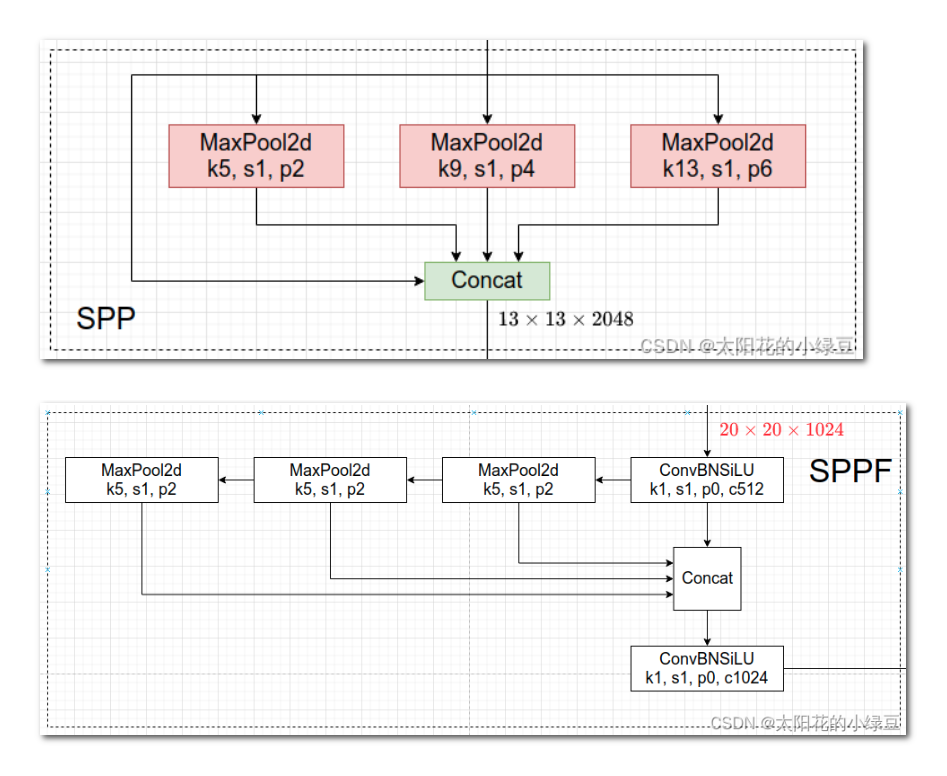 - YOLOv5 改空间空间金字塔池化 (SpatialPyramidPooling,SPP) 得到,主要思想是:将输入串行通过多个不同大小的 MaxPool,然后做进一步融合,两者的作用是一样的,但后者效率更高