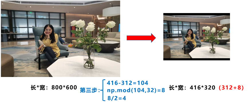 - 第三步:计算黑边填充数值,网络进行了 5 倍下采样,网络填充部分能被 32 整除的部分到最后也是背景,不被 32 整除部分可能参与预测