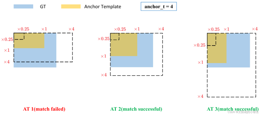 - 3)跨分支预测: 假设一个 GT 框可以和 2 个甚至 3 个预测分支上的 anchor 匹配,则这 2 个或 3 个预测分支都可以预测该 GT 框, 即一个 GT 框可以由多个预测分支来预测,重复 anchor 匹配和 grid 匹配的步骤,可以得到某个 GT 匹配到 的所有正样本