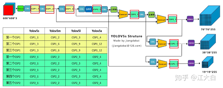 - 输入:608x608 输出多尺度预测结果:19x19/38x38/76x76