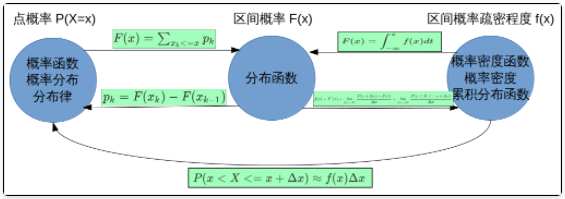 - 概率密度函数 (概率密度): 连续型随机变量由于其变量的无穷,求概率时会引入积分概念