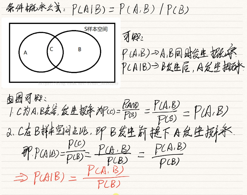 - P (A|B) 是在 B 发生的情况下 A 发生的概率; 也叫作 A 的后验概率,是在 B 事件发生之后,对 A 事件概率的重新评估